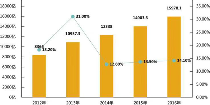 2016年全國(guó)家政市場(chǎng)規(guī)模為1.6萬(wàn)億元,年增長(zhǎng)14%